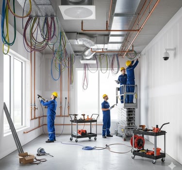 Instalación y mantenimiento de redes eléctricas y sanitarias, aire acondicionado, alarmas, CCTV, montaje de prefabricados y acabados (carpintería, pintura, soldadura). Brigadas técnicas certificadas.